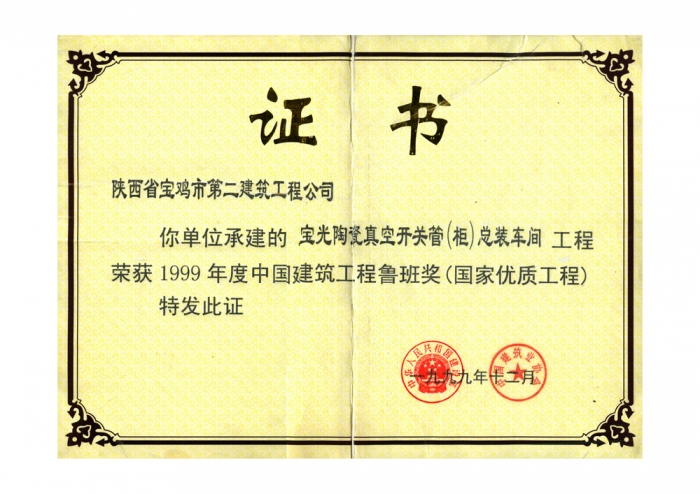 1999年魯班獎(jiǎng)(寶光陶瓷真空開(kāi)關(guān)柜)